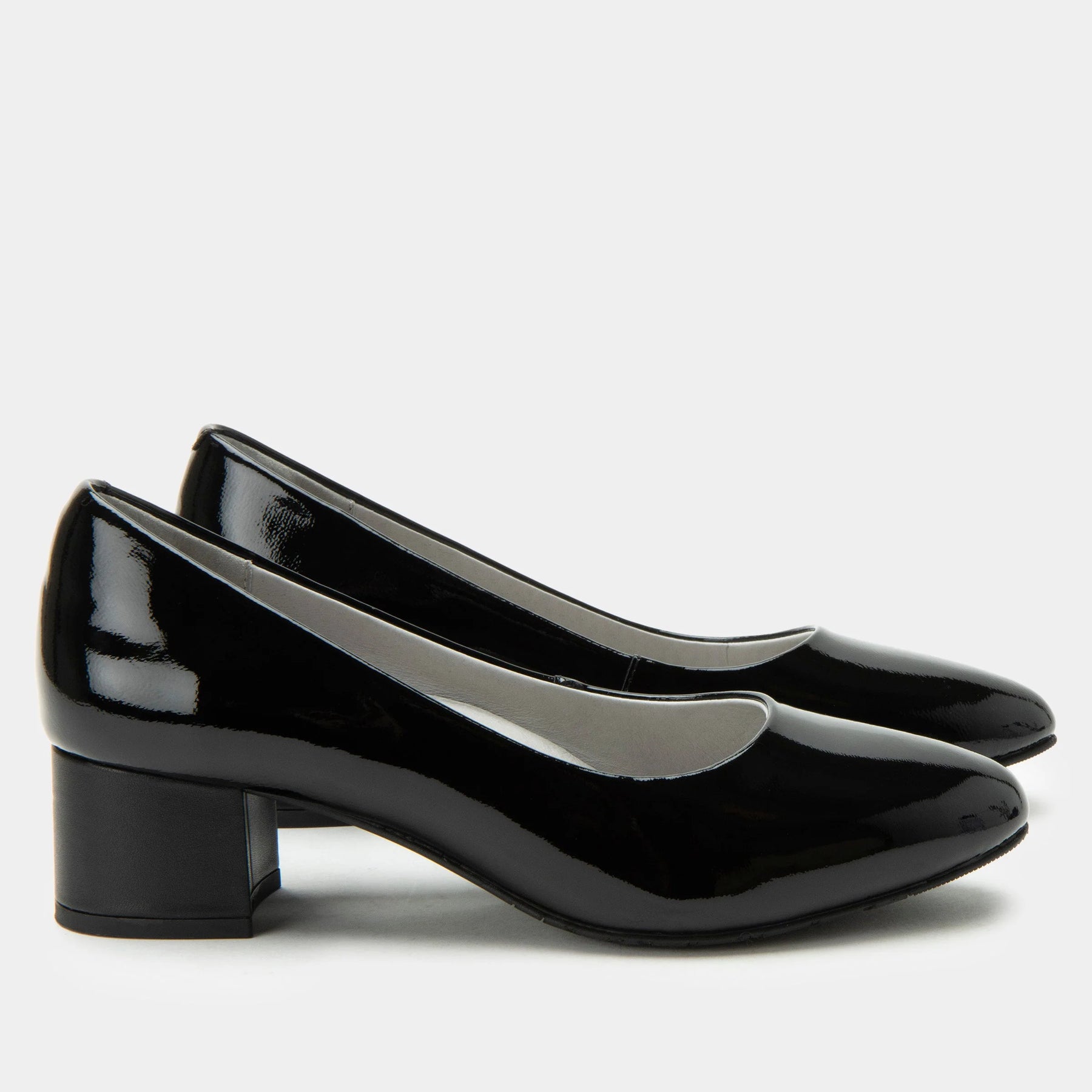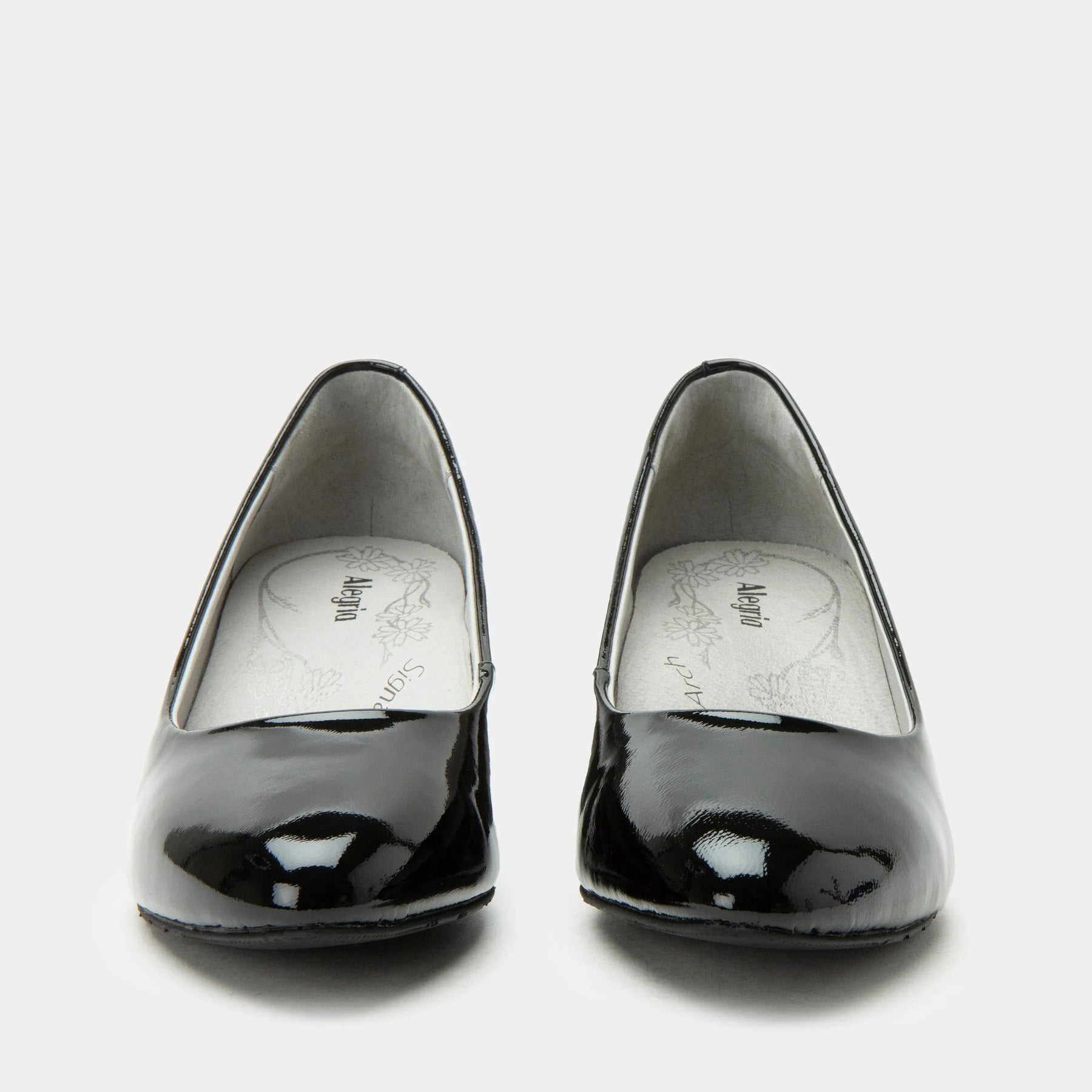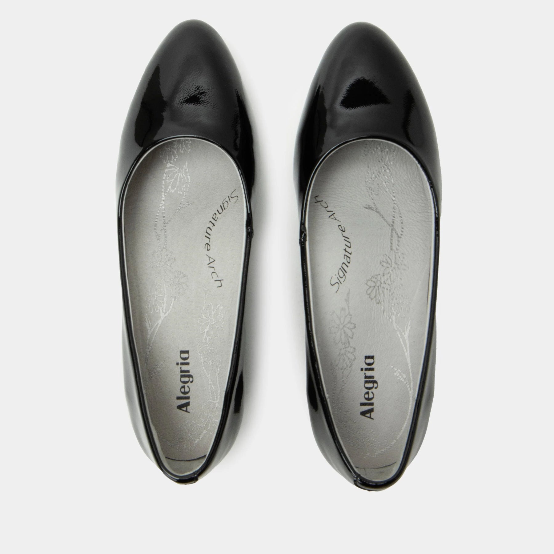 Women’s Alegria Lisah black patent leather pumps featuring contoured arch footbed, cushioned heel, and slip-resistant sole for all-day comfort and elegance.