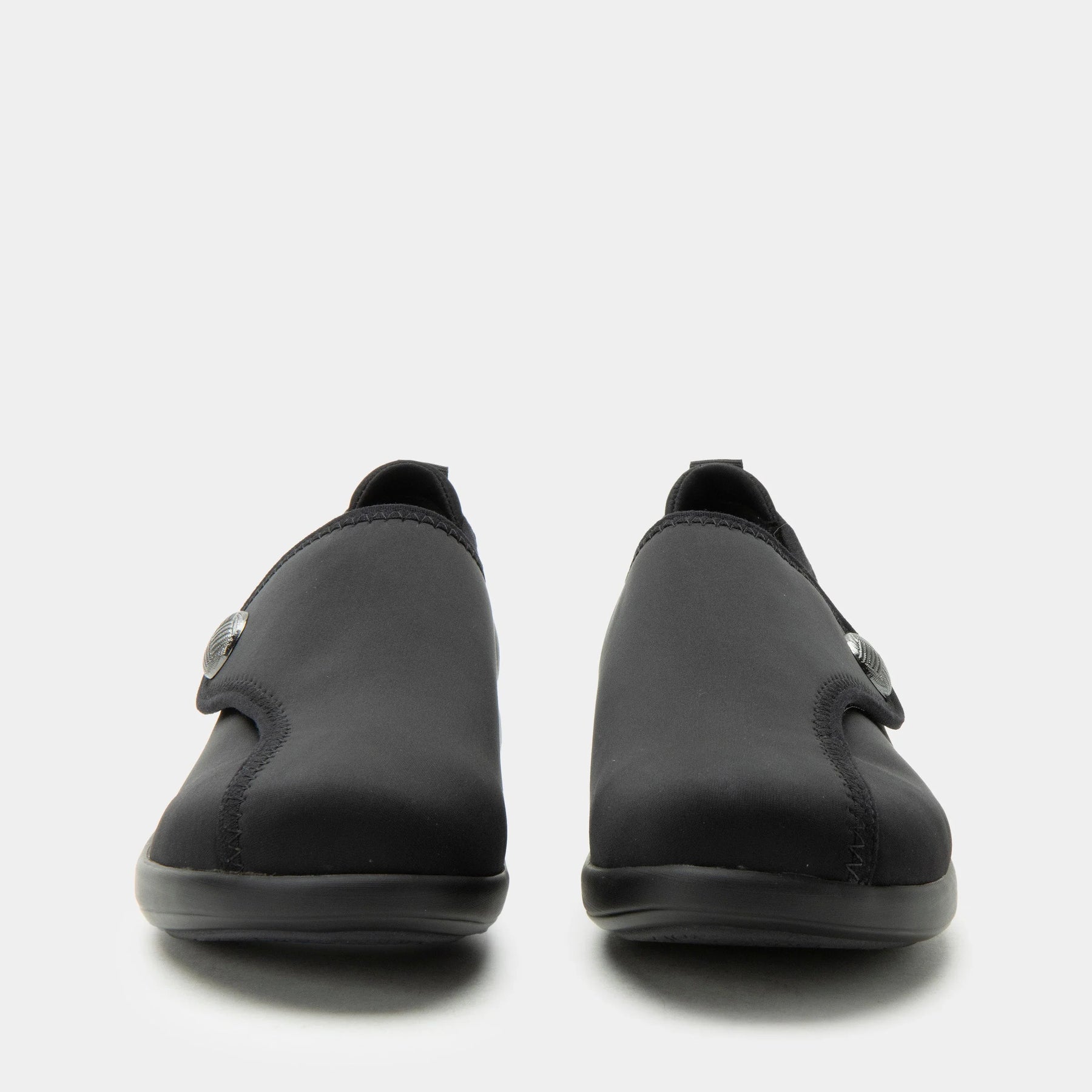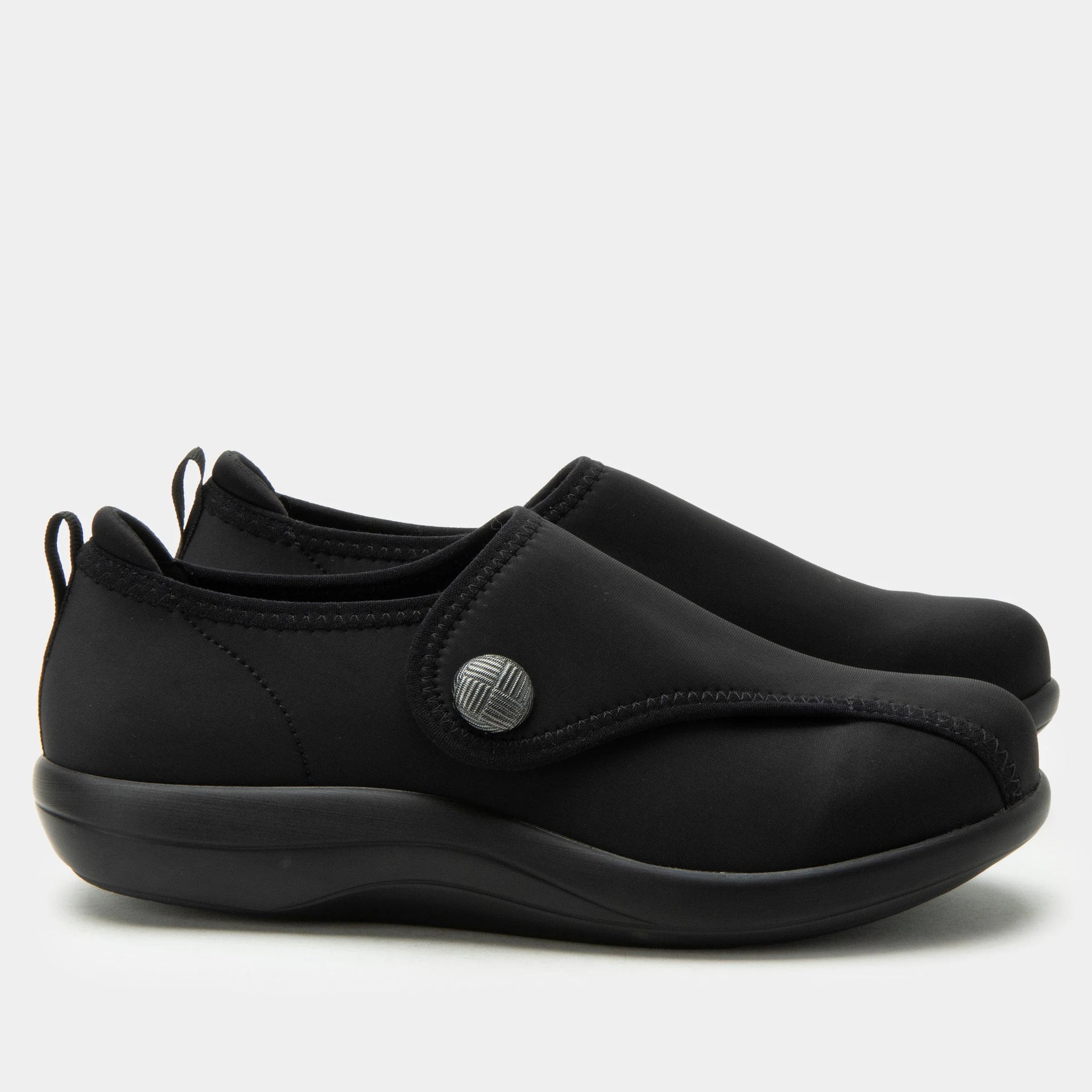 Black Alegria Marilynn stretch neoprene comfort shoes with adjustable strap, wide fit, cushioned lining, and slip-resistant outsole for flexible all-day wear.