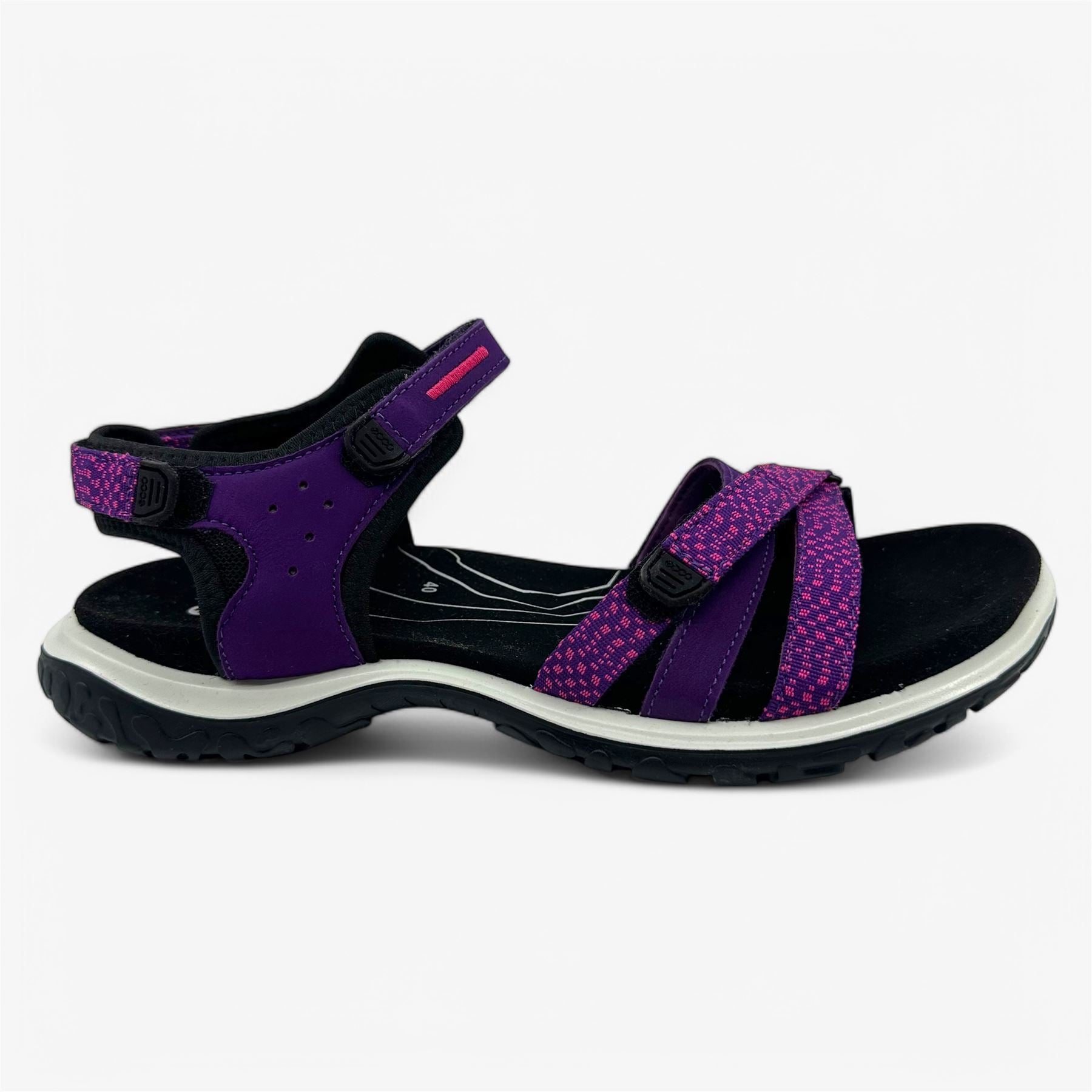ECCO OFFROAD ROAM purple and black outdoor sandals with a three-strap design, cushioned footbed, and durable sole, providing comfort and stability for outdoor adventures.