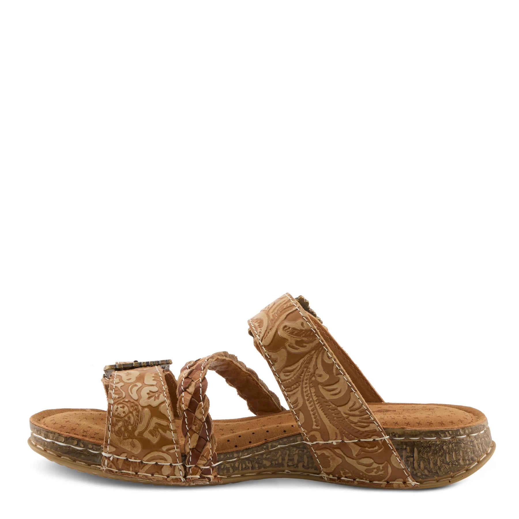 padded insole cushions your feet with each step. The corked sandal has double hook and loop Velcro closure across the toe and at the ankle, paired with an antiqued embossed buckle for fashionable leisure. The asymmetrical braided middle strap hugs your foot and gives you all day support.