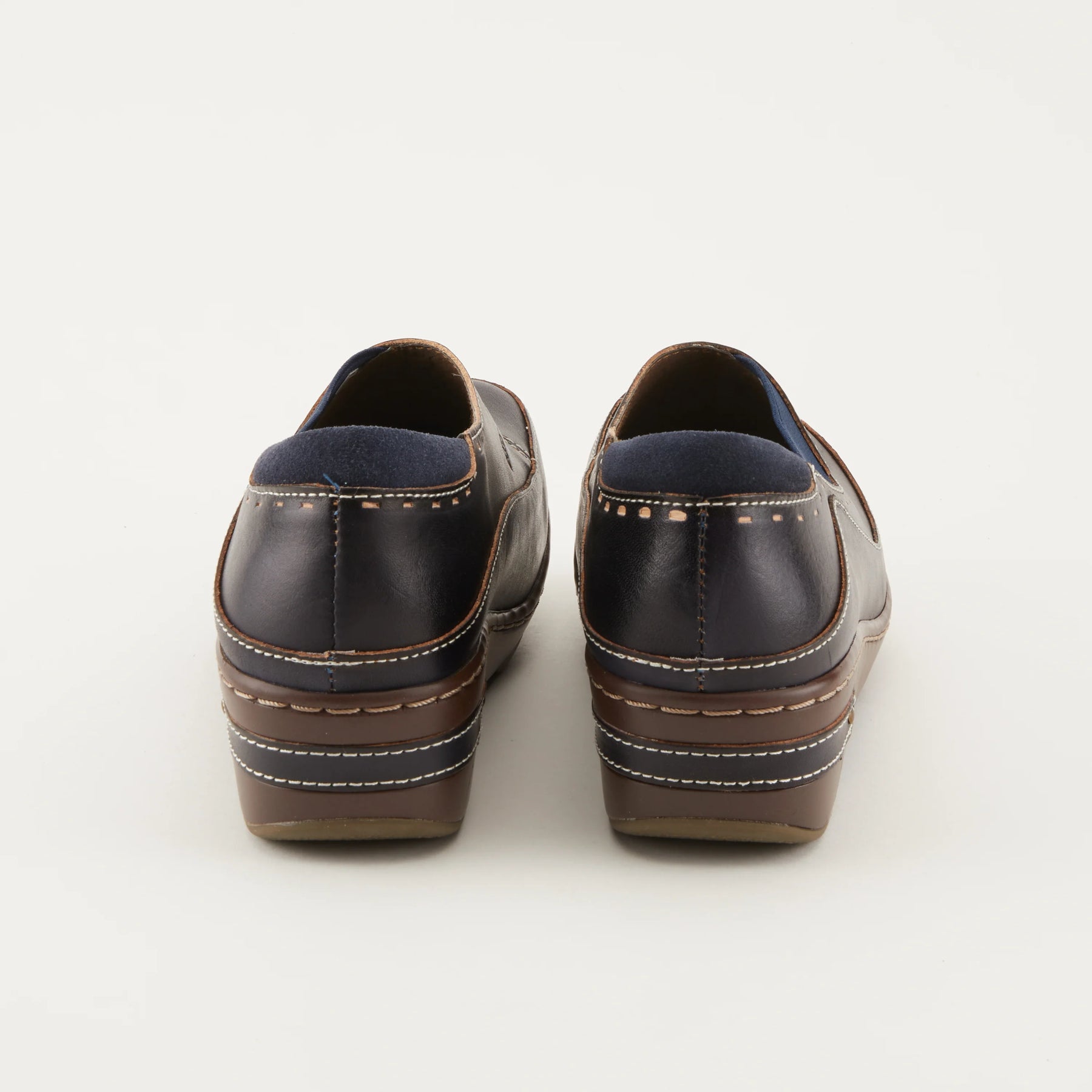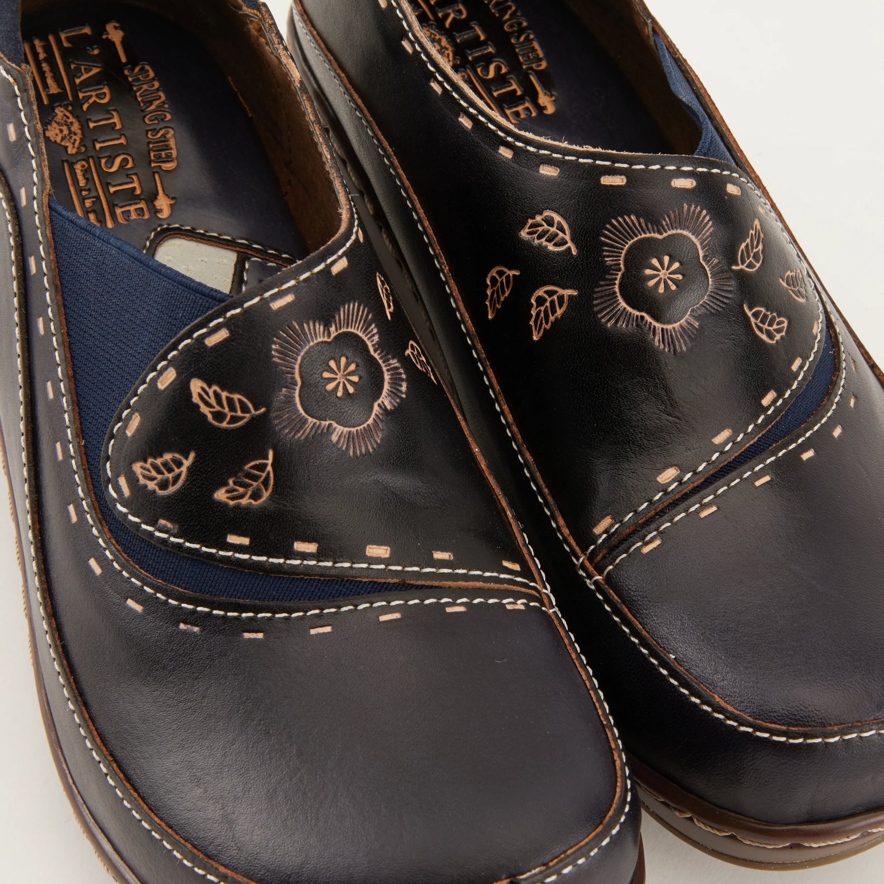 Women’s L’Artiste Burbank navy closed-back clogs with floral embossed leather, cushioned insole, and 2-inch comfort heel.