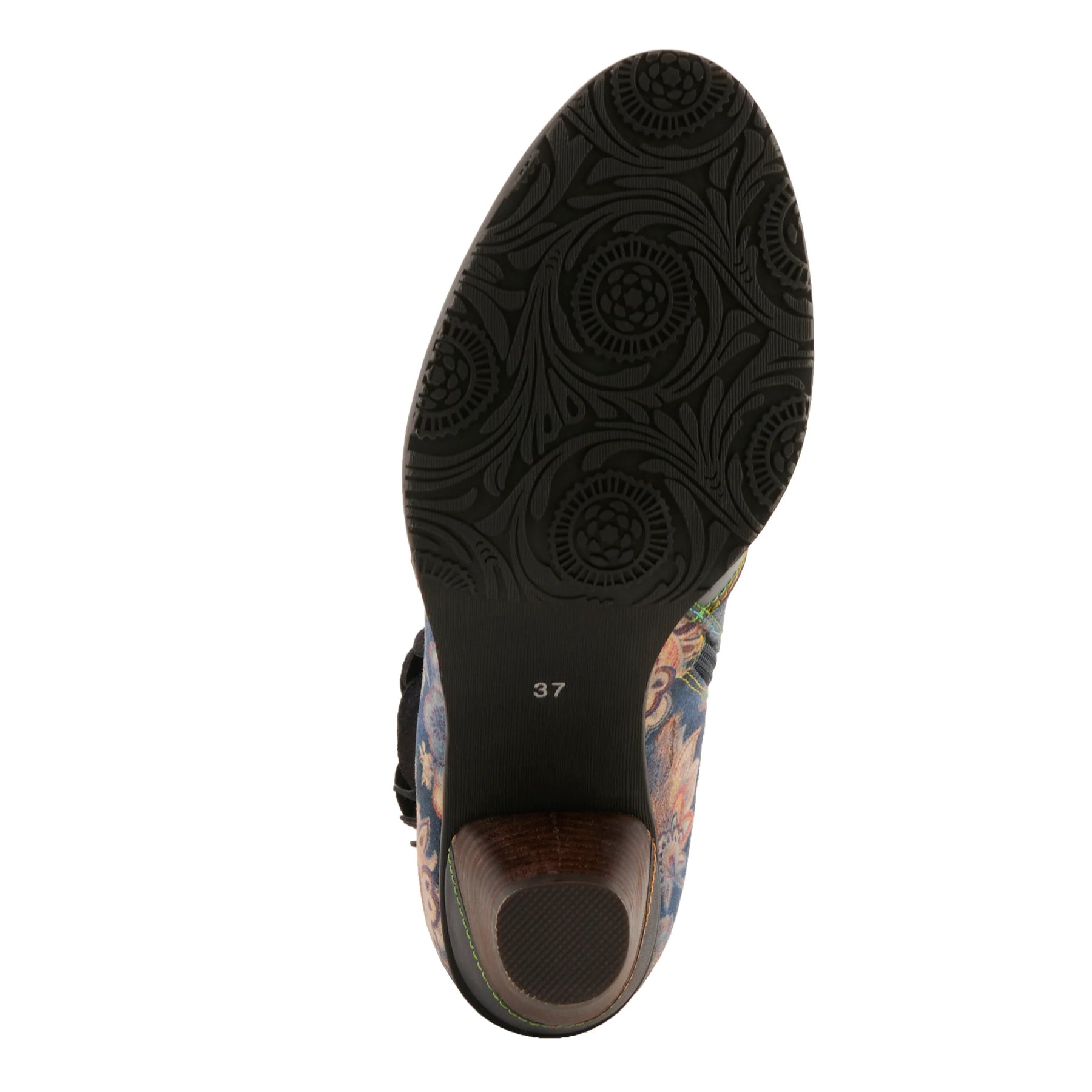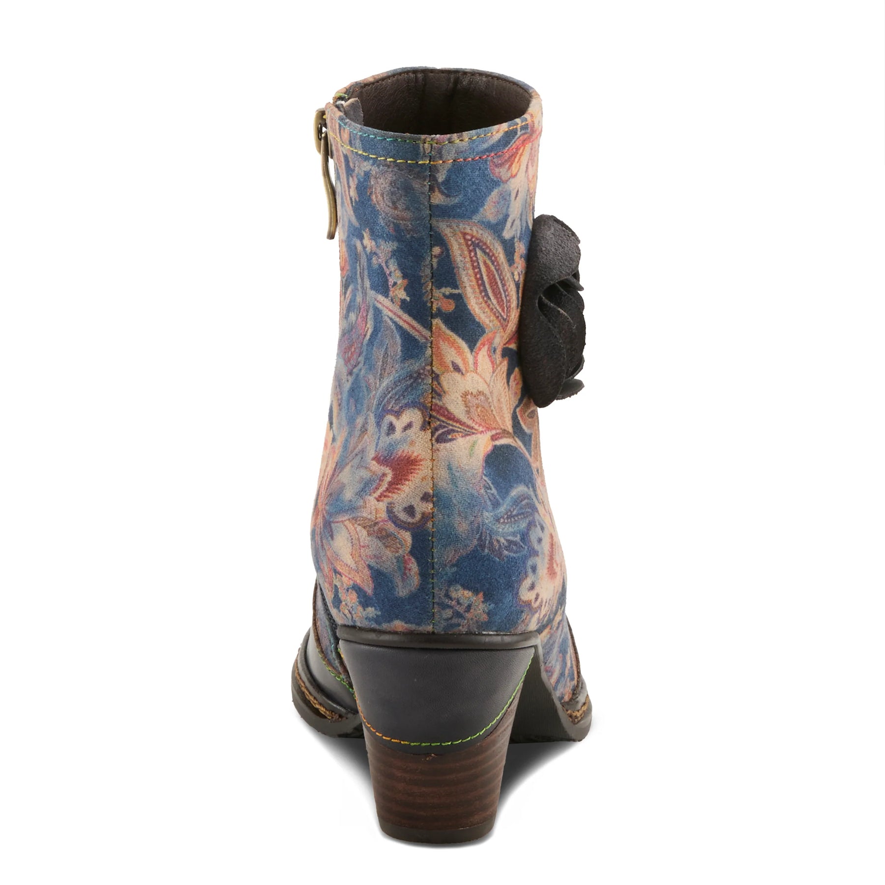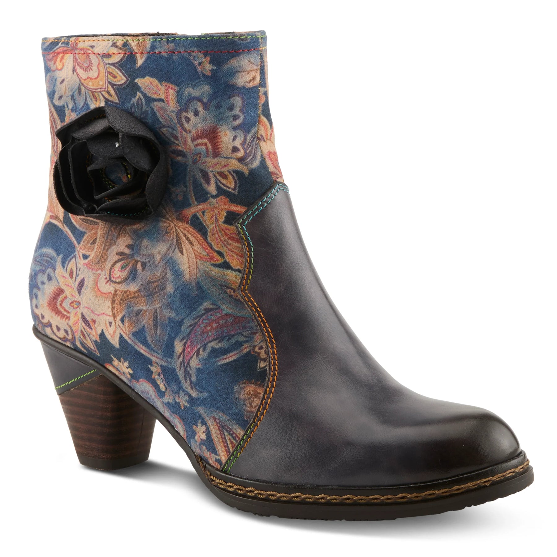 Step into effortless elegance with this stunning ankle boot, where artistry meets modern fashion. Crafted with a luxurious leather combo upper, it features a bold contrast of smooth and floral-printed panels, accentuated by an intricate cutout rose embellishment. A stacked mid-heel offers the perfect balance of height and stability, while the cushioned insole ensures all-day comfort. Designed with an inside zip for easy wear, this boot seamlessly blends chic sophistication with contemporary flair. Whether you''re dressing up or adding an artsy touch to everyday wear, this standout piece is a must-have for trendsetters.