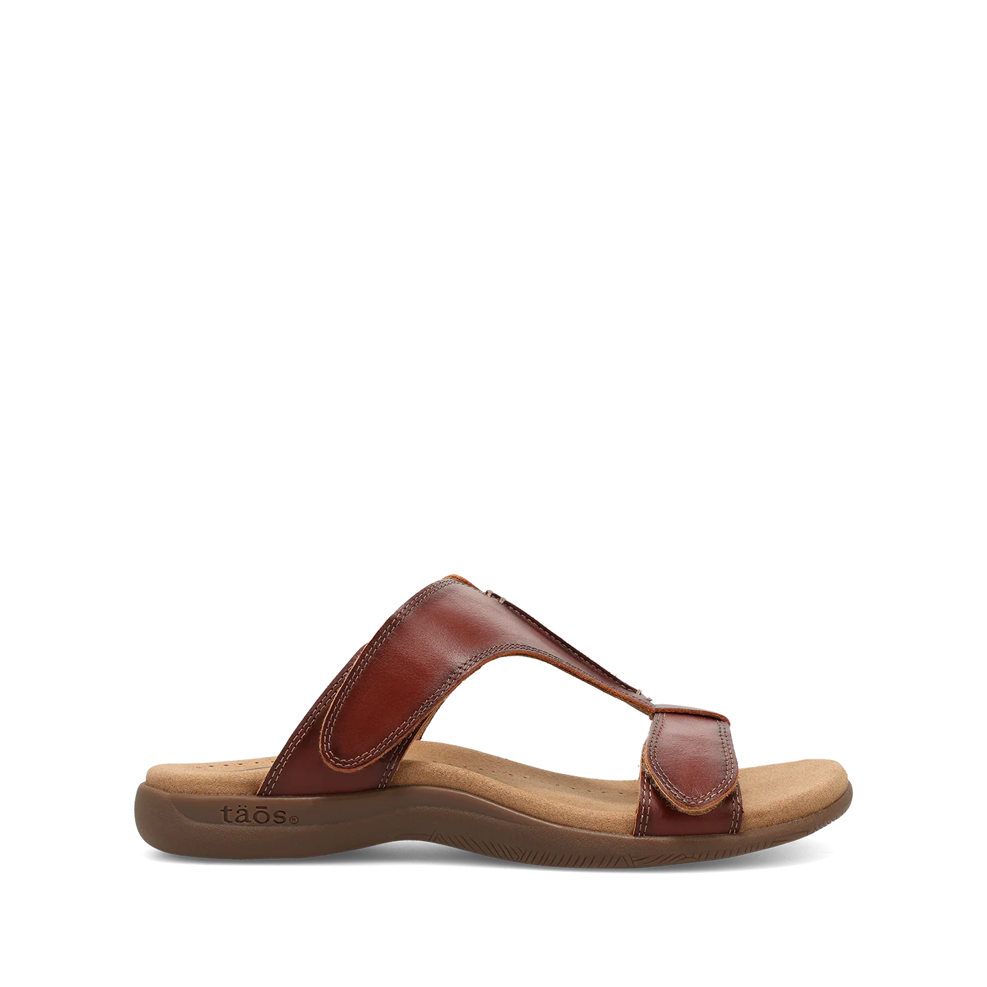 Women’s Taos Slide Show leather slide sandal with adjustable hook-and-loop straps, arch and metatarsal support, cushioned footbed, and flexible rubber outsole.